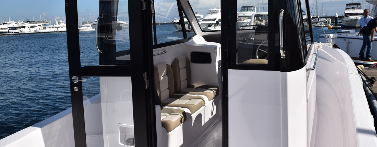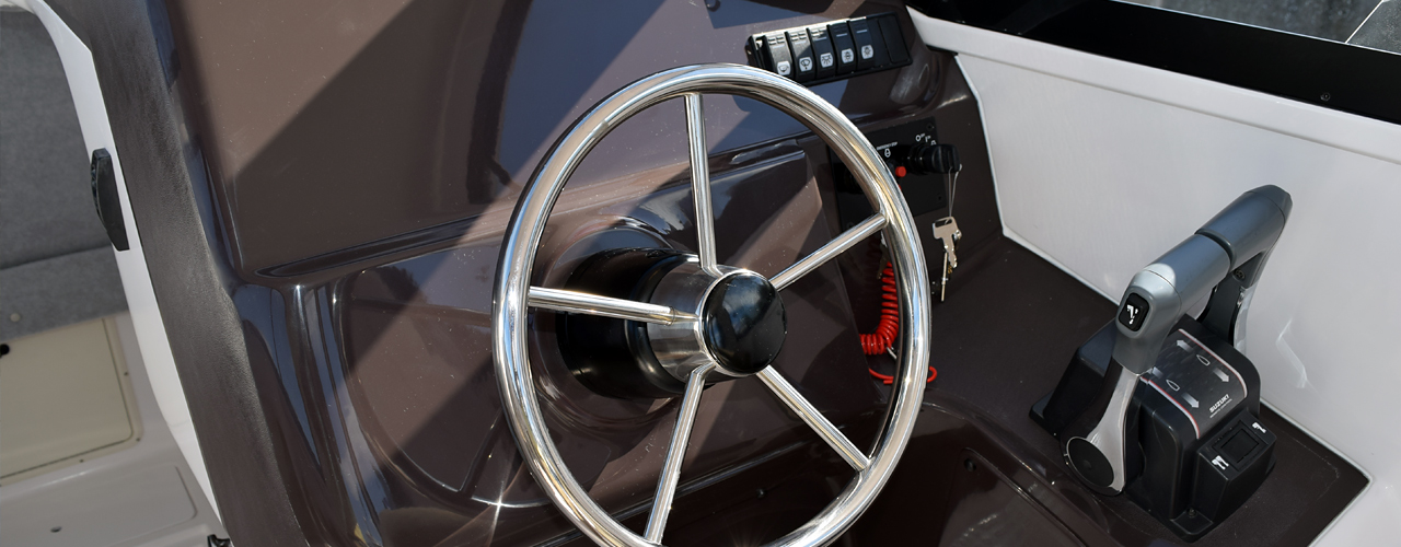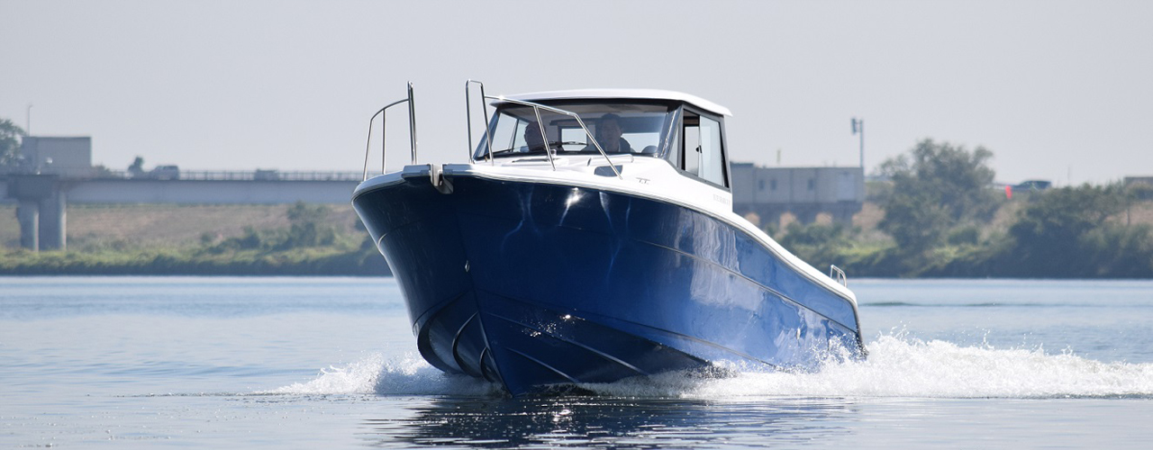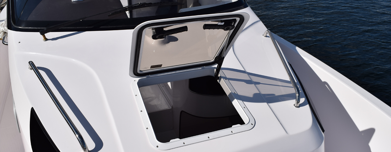 天井高と開放感があるゆったりしたキャビン内でくつろぎ、フラットなスターンデッキ・ウォークアラウンドタイプの広いバウデッキでは、思う存分海上レジャーを楽しんでいただけます。プレジャーボートに速さと広さと操縦する楽しさを求める、贅沢なオーナーに最適な一艇です。
