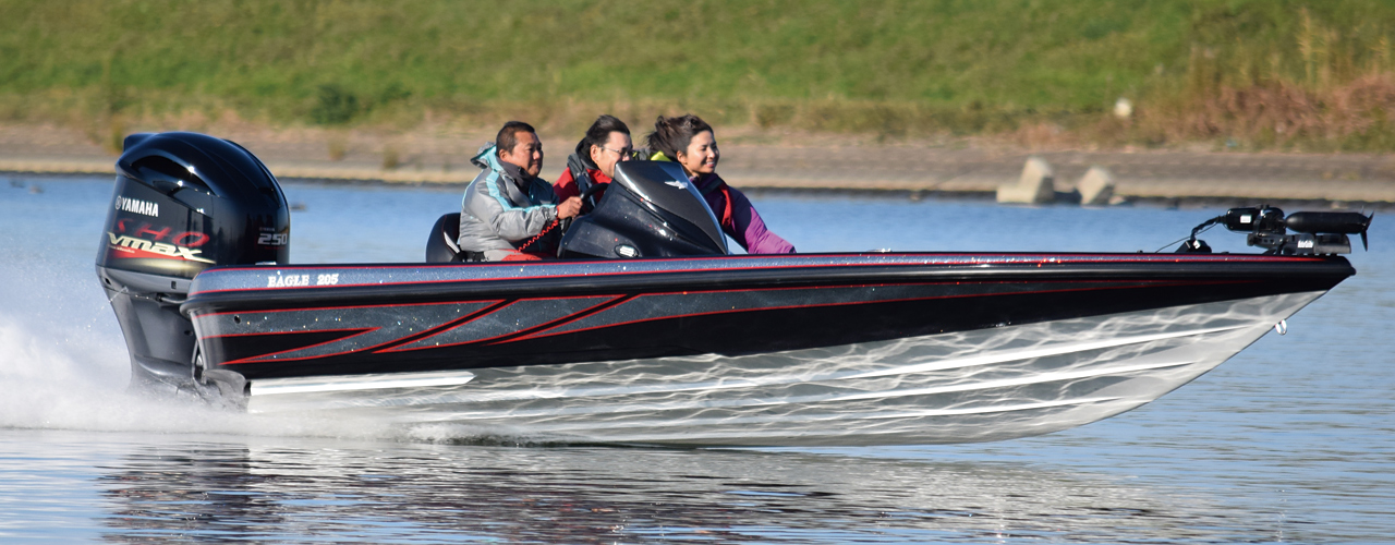 フルサイズ20フィートのバスボート製造、それは国産バスボートメーカーとしての長年の夢であり、目標でした。輸入艇に負けないクオリティ、国産ならではの細部にまでこだわった使いやすさ、広大なフロントデッキ、バッテリースペースやメンテナンスのことを考え尽くした輸入艇を圧倒する広大なリアストレージ、そして何よりラフウォーターや高速でも安定して航行できる走波性の高さ。脈々と受け継がれてきた国産バスボートEAGLEシリーズの歴史に2016年新たな1ページが刻まれました。