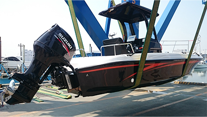 オーダーすることになってからは、ポテンシャルの高いボートをカスタマイズして自分の理想形にどこまで近づけられるかの相談を何回も重ねて、完成までに工場に4度ほど足を運ばせてもらいました。ハルのカラーやストライプ・ピンストの色・フレークの配合も完璧にイメージ通りにしてもらったり、200馬力のSUZUKIの4ストを積むために、ハルとトランサムの強化もお願いしました。バウデッキの拡張・ストレージ化や、バウレールの高さ・形状もワンオフで制作してもらいました。