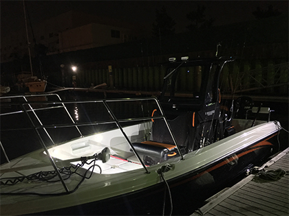 湾奥のナイトシーバスをメインにしているため、水面に明かりを漏らさず、デッキのみを明るく照らすLEDも装備。コンソール上には、さらに明るくデッキ全体を照らすLED・フィールドの状況確認用のLEDも装備。